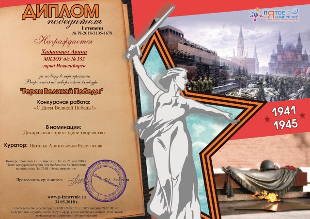 Хаданович Арина - победитель I степени в мероприятии Всероссийский творческий конкурс "ГЕРОИ ВЕЛИКОЙ ПОБЕДЫ"