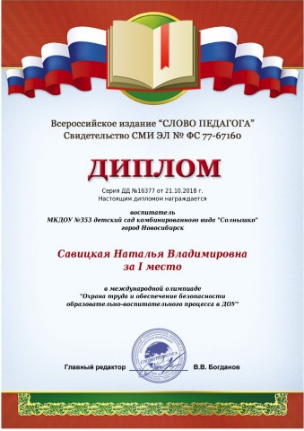 Савицкая Наталья Владимировна - Диплом 1 место в международной олимпиаде "Охрана труда и обеспечение безопасности образовательно-воспитательного процесса в ДОУ" |