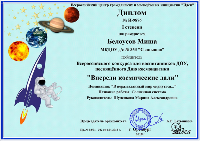 Белоусов Миша - Победитель I степени Всероссийского конкурса для воспитанников ДОУ, посвященного Дню космонавтики в номинации "В неразгаданный мир окунутться..."