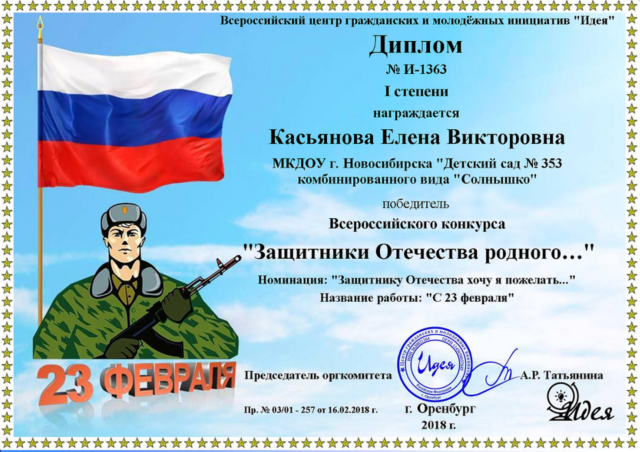 Касьянова Елена Виикторовна - Диплом победителя I степени Всероссийского конкурса "Защитники Отечества родного..."