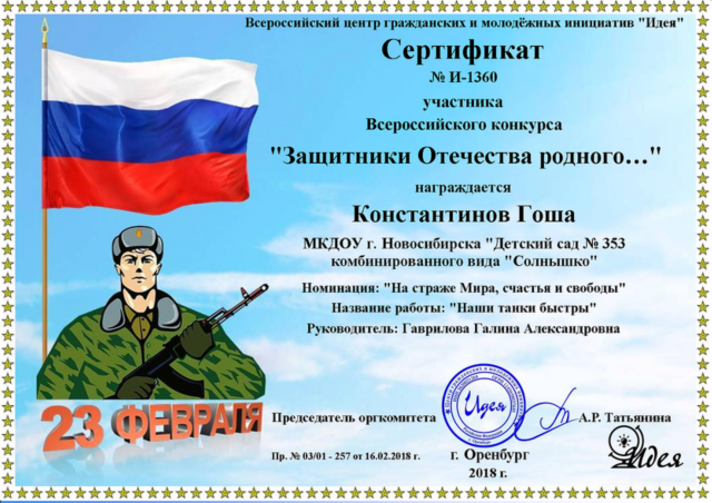 Константинов Гоша - сертификат участника Всероссийского конкурса "Защитники Отечества родного..."