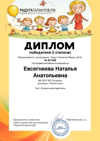 Евсегнеева Наталья Анатольевна - победитель I степени Всероссийского тестирования "Радуга талантов". Дошкольная педагогика |