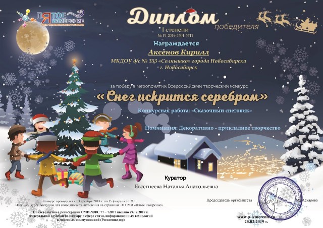 Аксенов Кирилл - Диплом победителя I степени в мероприятии Всероссийский творческий конкурс:"Снег искрится серебром". Конкурсная работа:"Сказочный снеговик". Номинация:"Декоративно-прикладное творчество"